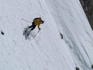 On saute la rimaye (Chu réussit son Backflip mais loupe le grab...) et on se retrouve tous les trois en bas; bien content d'avoir skié cet itinéraire (ouvert par Pierre Tardivel en juin 89) plus raide, plus technique et surtout moins classique que la NNE. En plus, départ ski au pied depuis le sommet des Courtes : ça biche !!